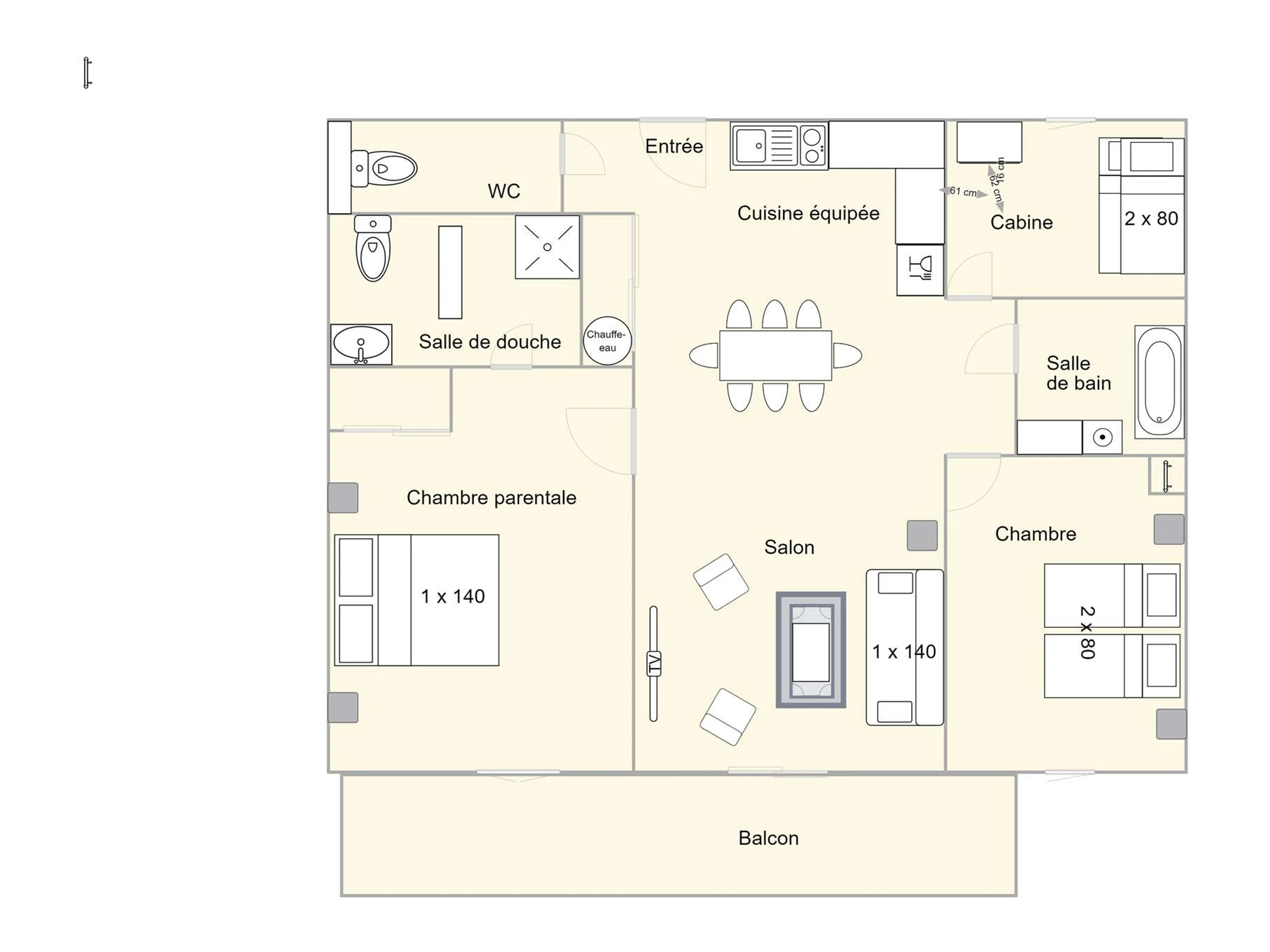 L'appartement se compose d'un séjour avec un canapé convertible 140, d'une suite parentale avec un lit 140 et une salle d'eau avec WC attenante, d'une chambre avec deux lits 80 côte à côte, d'une cabine avec deux lits superposés 80 (NB : le lit supérieur d'un lit superposé est interdit aux - 6 ans), d' une salle de bain et WC séparé.
