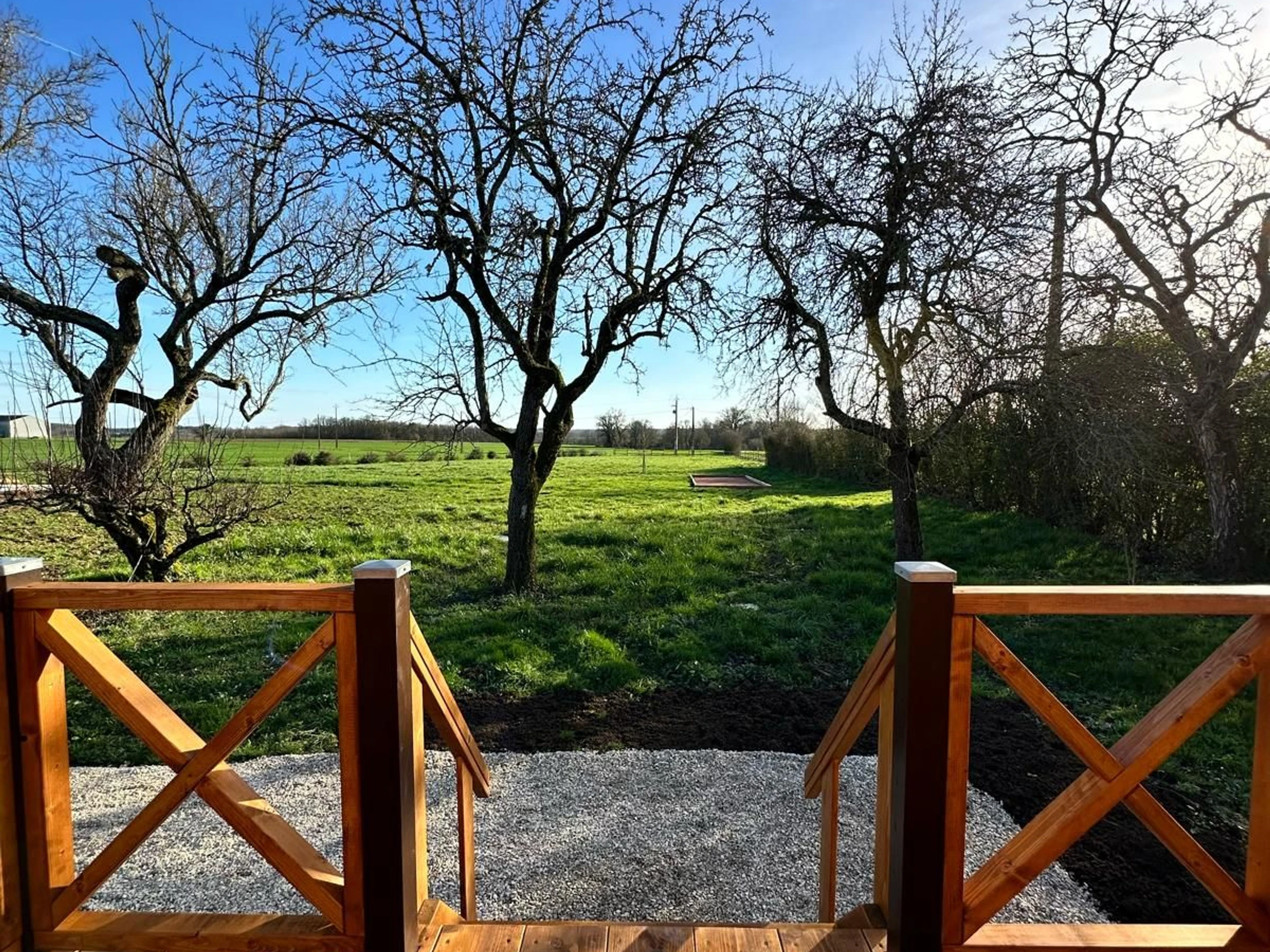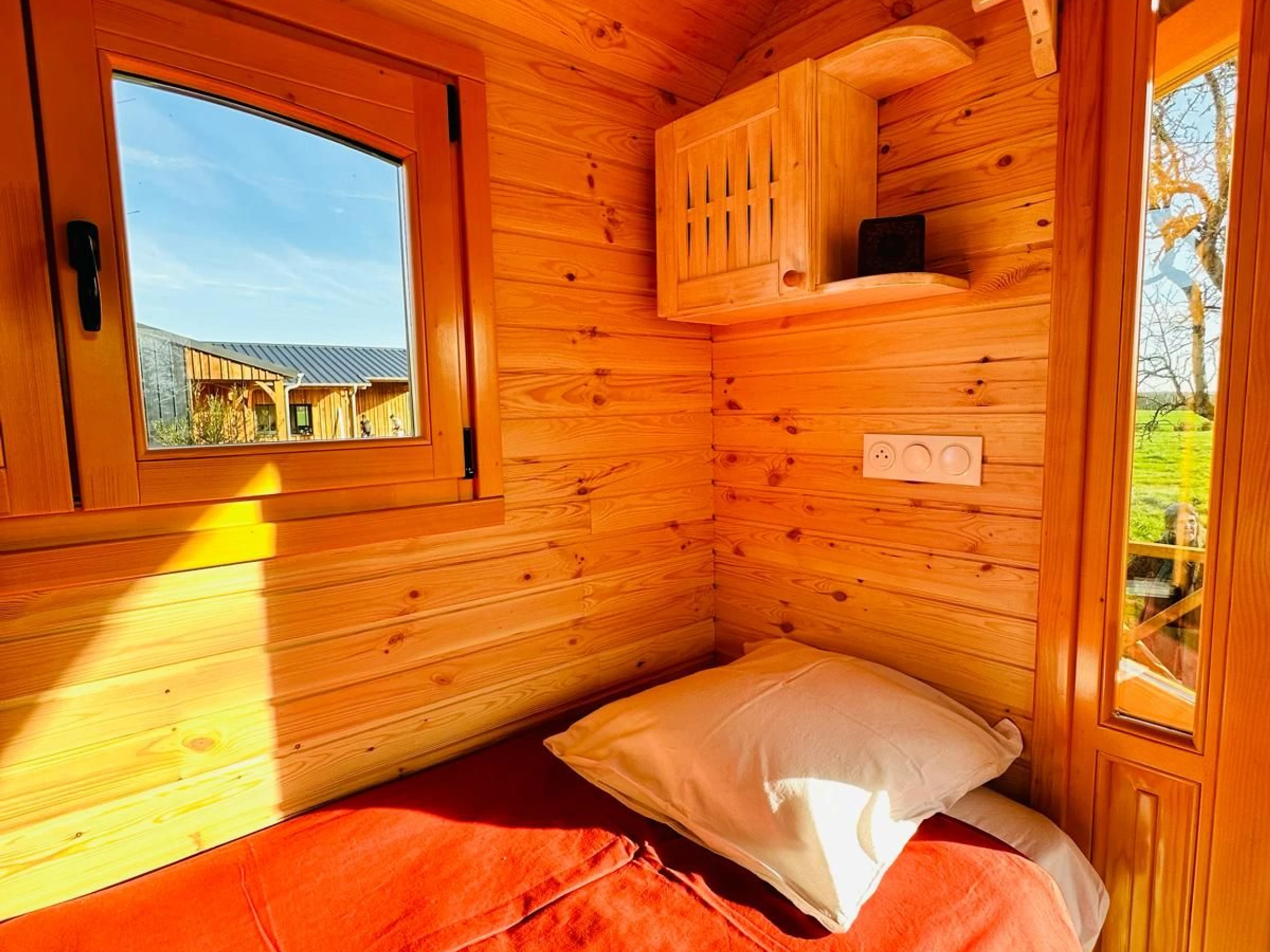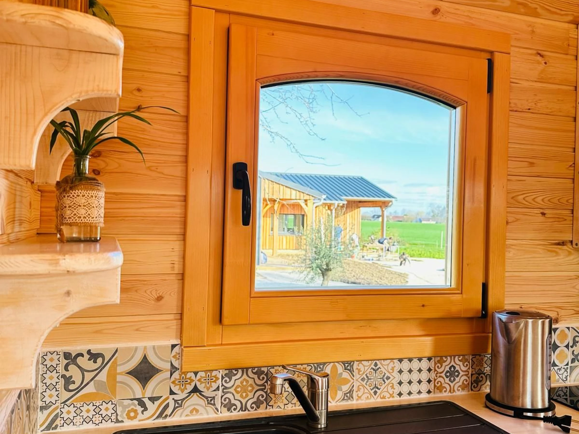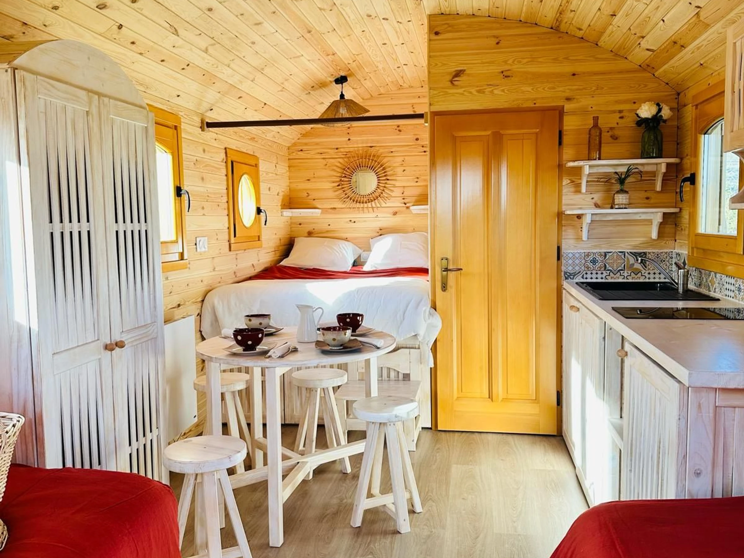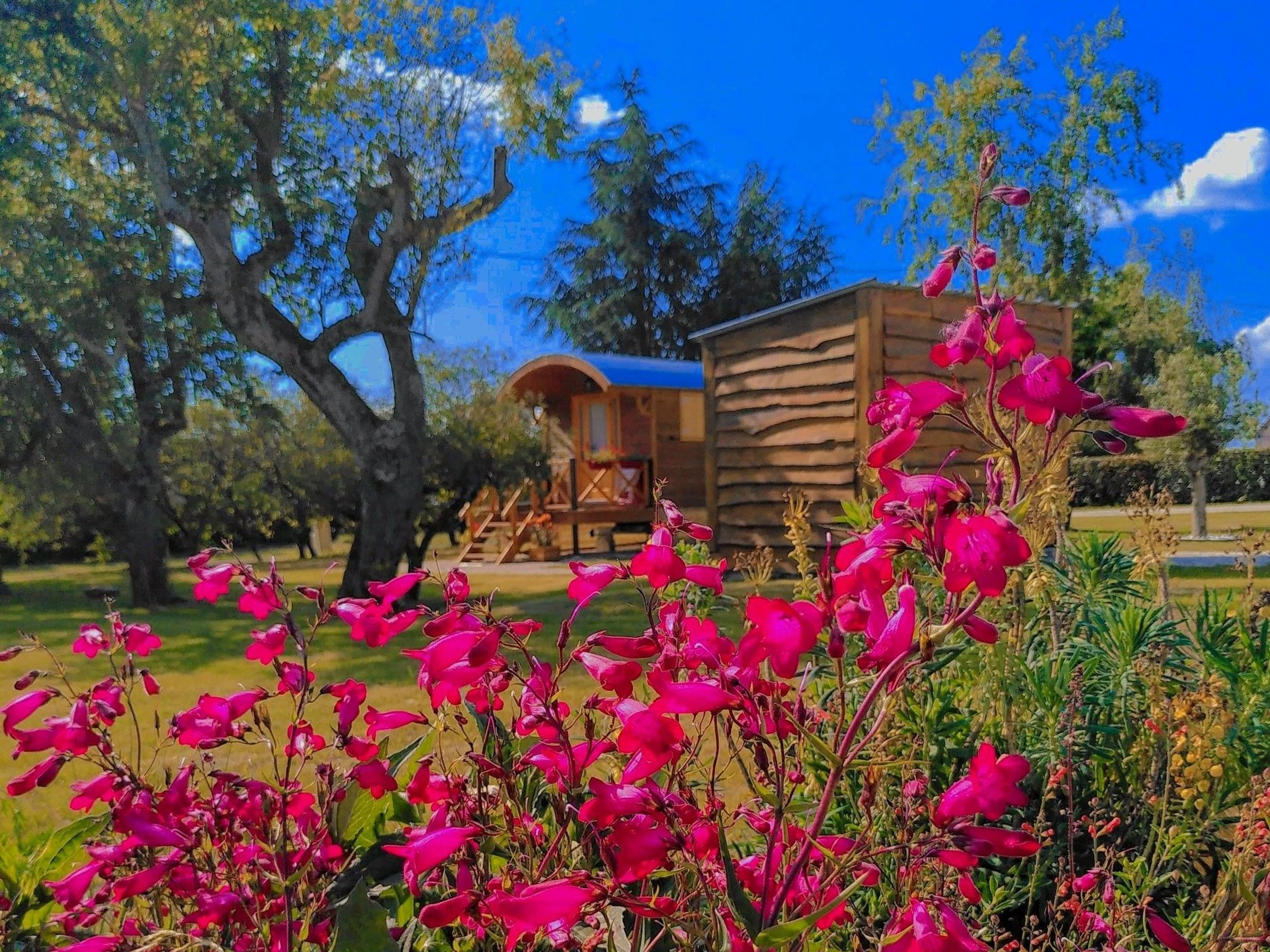À l'extérieur, une terrasse de 6 m² exposée au sud, avec table et chaises, est disponible. La roulotte est situé sur un domaine où se situe des chambres d'hôtes. Les équipements partagés incluent un salon lounge, une salle de dégustation, une terrasse et une piscine chauffée (juin à août, selon météo).