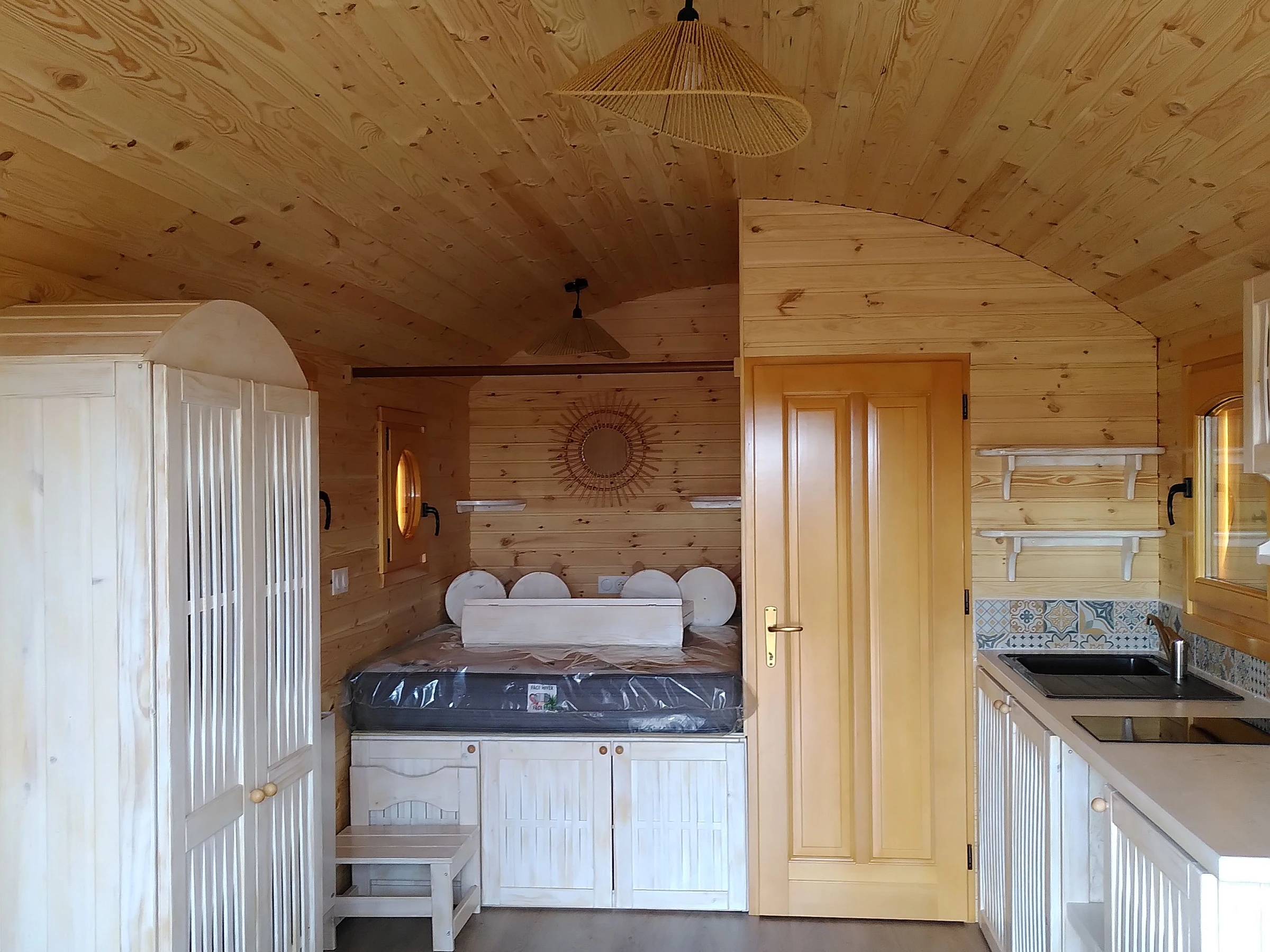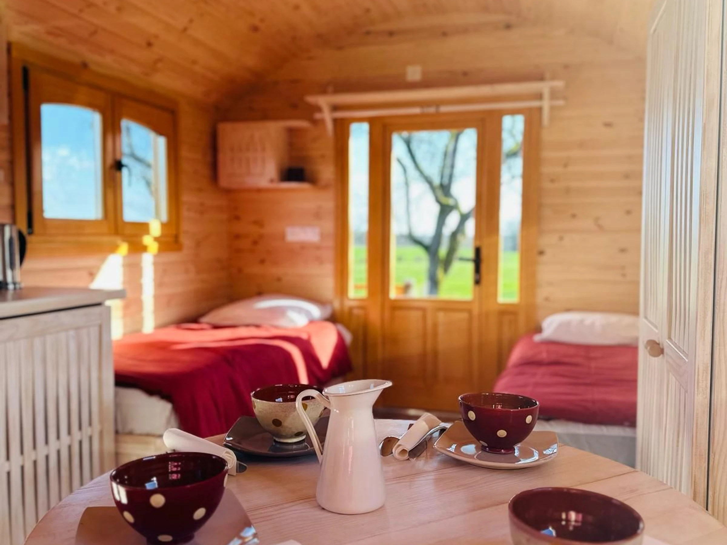 À proximité, découvrez des sites emblématiques comme le Château de Valençay, le ZooParc de Beauval, et le Parc Naturel de la Brenne pour des randonnées en pleine nature. Située à une courte distance des Châteaux de la Loire, cette roulotte est l'endroit parfait pour se détendre et explorer la richesse culturelle et naturelle de la région. La roulotte de Florette, faite à la main en bois d'épicéa, offre un hébergement original de 19,5 m² pour 4 personnes. Elle comprend 1 lit double (140 x 190 cm) en alcôve et 2 lits simples (80 x 190 cm). À l'intérieur, une kitchenette équipée, une table avec 4 tabourets, ainsi qu'une salle de bain avec douche, lavabo, WC, sèche-serviettes et sèche-cheveux sont à disposition. Plusieurs rangements sont prévus sous les lits et dans une armoire.