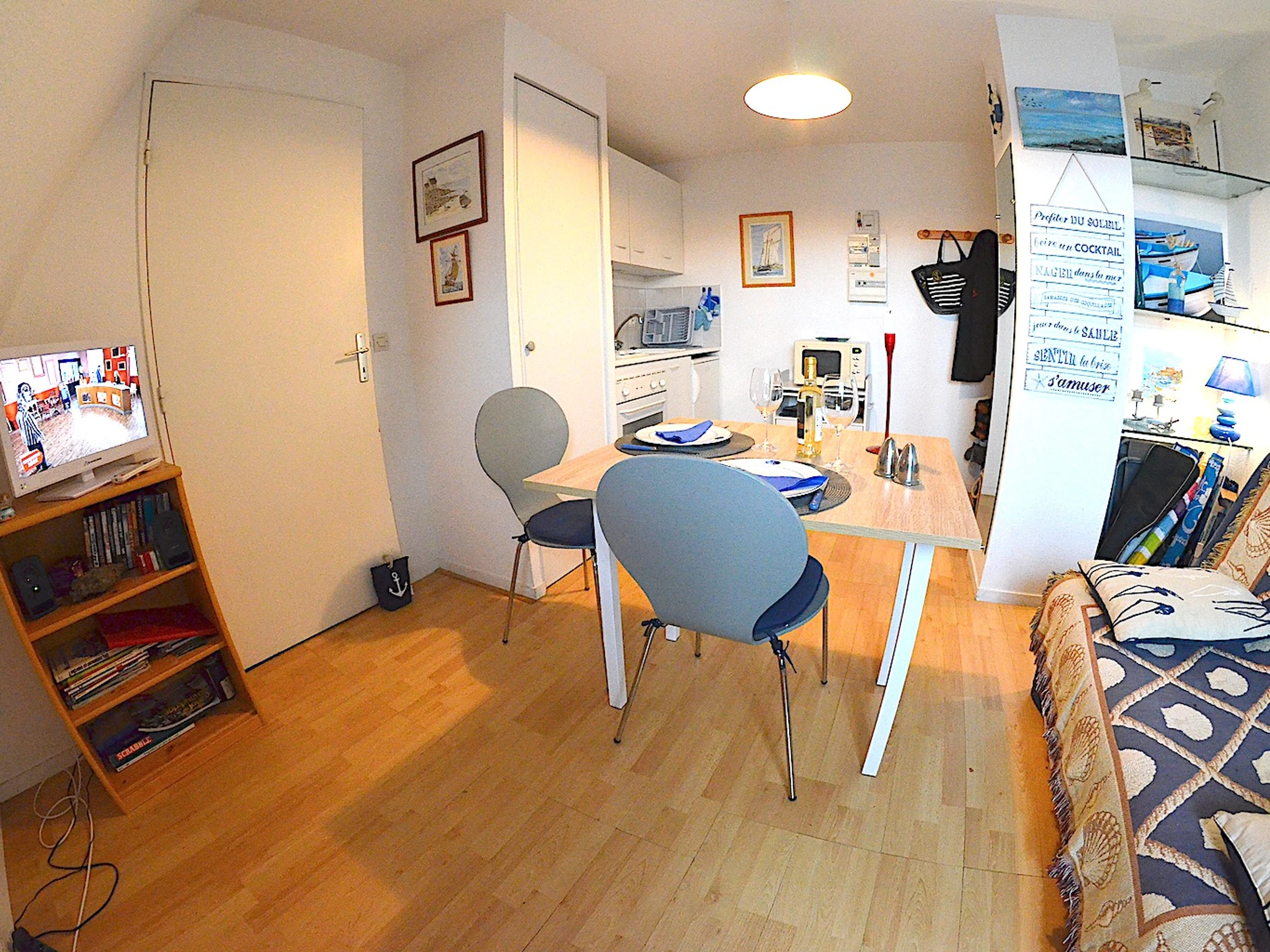 TV écran plat, prise USB. Jeux de société, livres. Nattes plages et chaises pliantes plage, parasol et abri plage 120x120.