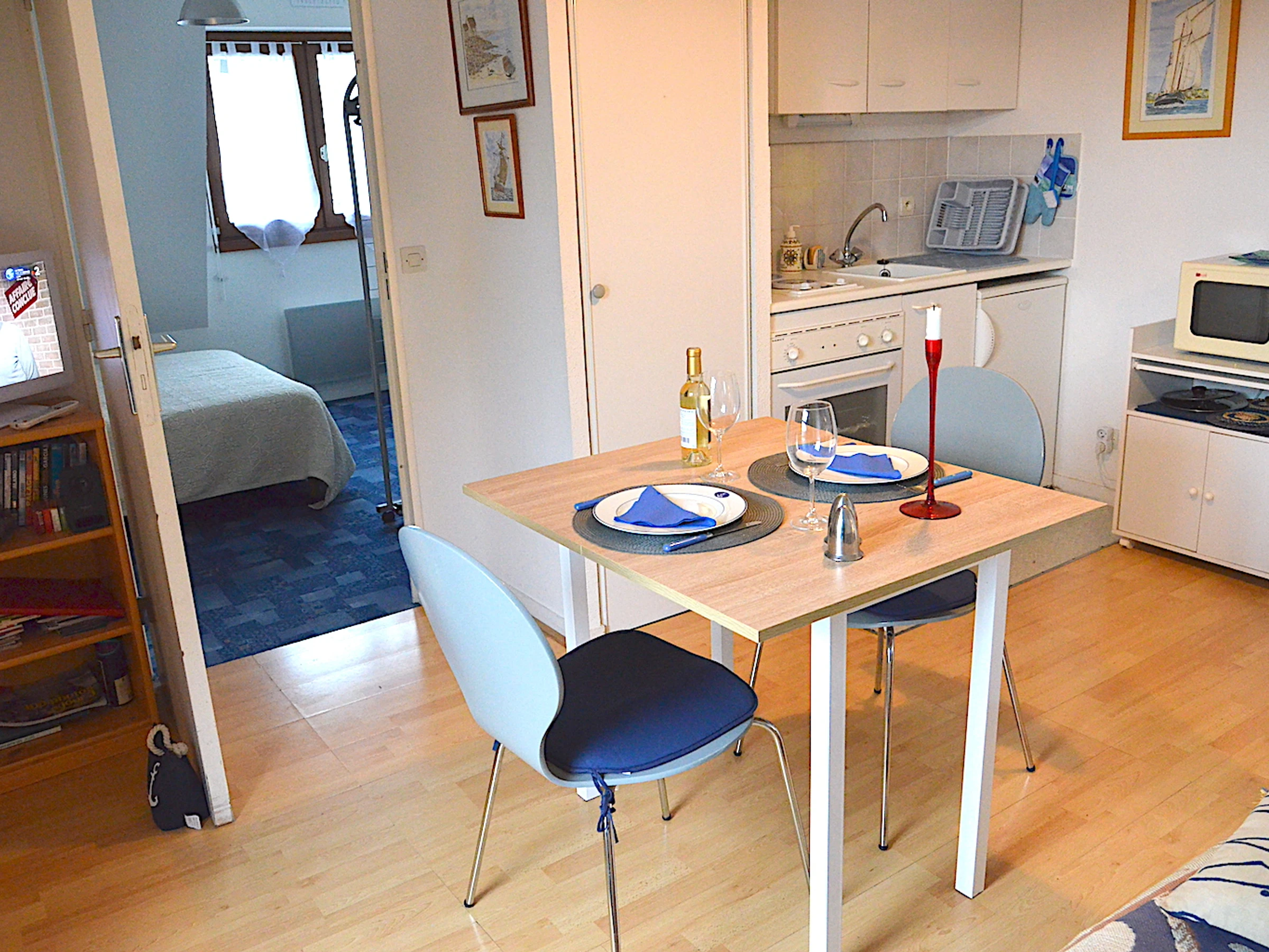 Cuisine équipée: grand four, frigo, micro-ondes, grille-pain, appareil à raclette, cafetière à filtre, fer et planche à repasser, aspirateur, produits de nettoyage.
