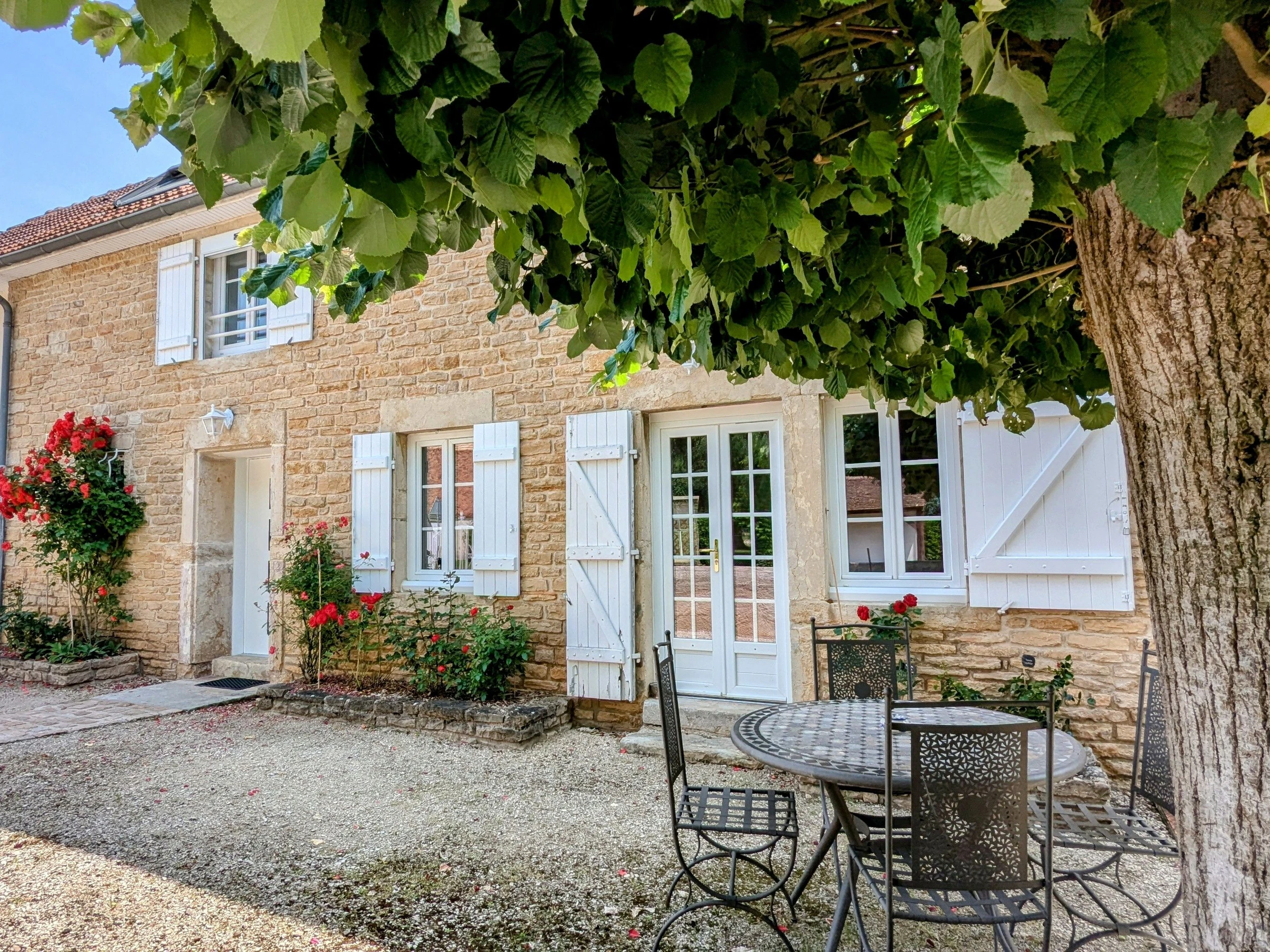 Le Gîte "Aux roses rouges", belle maison de campagne indépendante, rénovée est idéalement située entre Nuits Saint Georges et Beaune Au rez-de-chaussée : grand séjour avec cuisine moderne entièrement équipée ouverte sur le salon/salle à manger avec poêle à bois (bois fourni pour 1ère flambée), TV et Wifi. Murs et sols en pierre de Bourgogne. Accès direct à la cour et au jardin. WC indépendant.