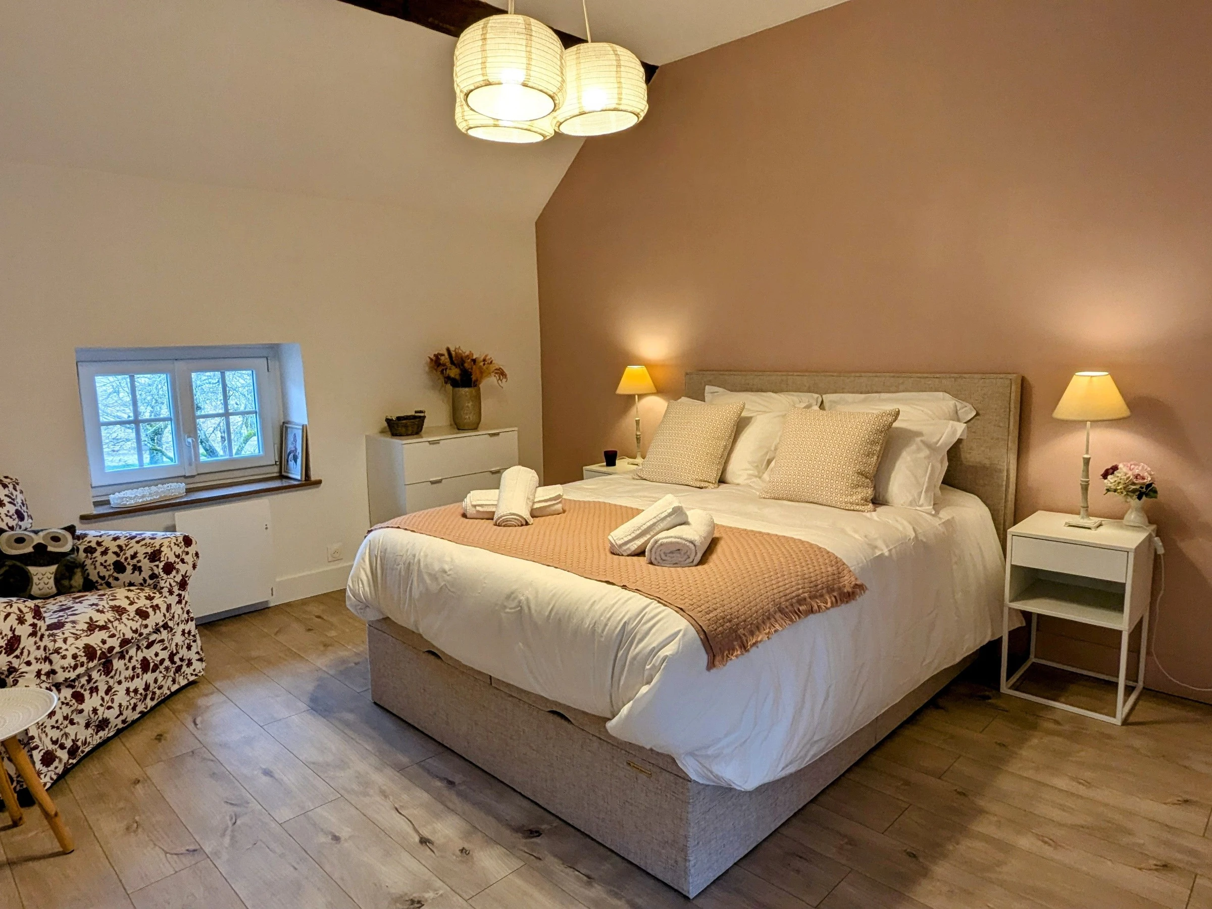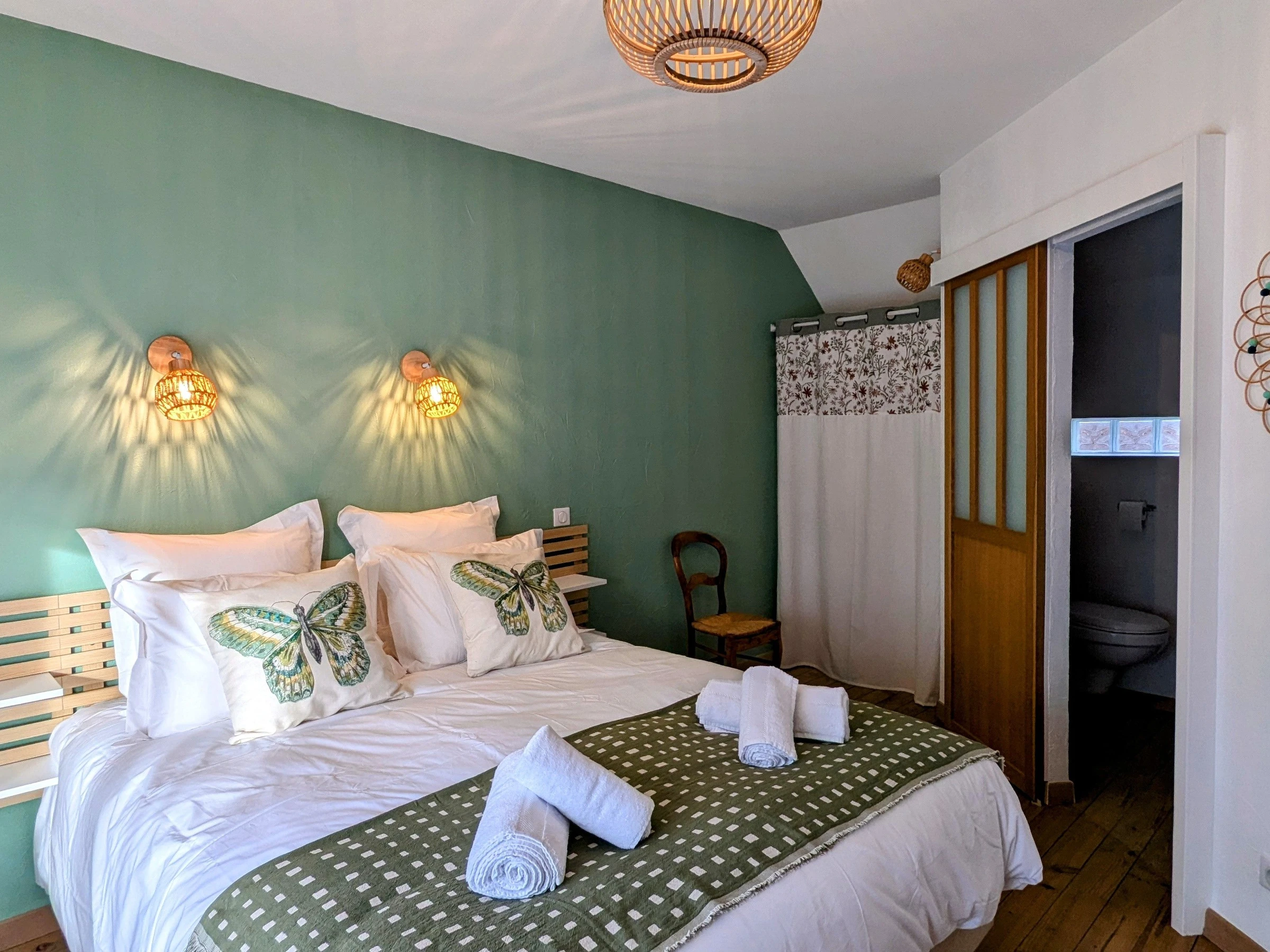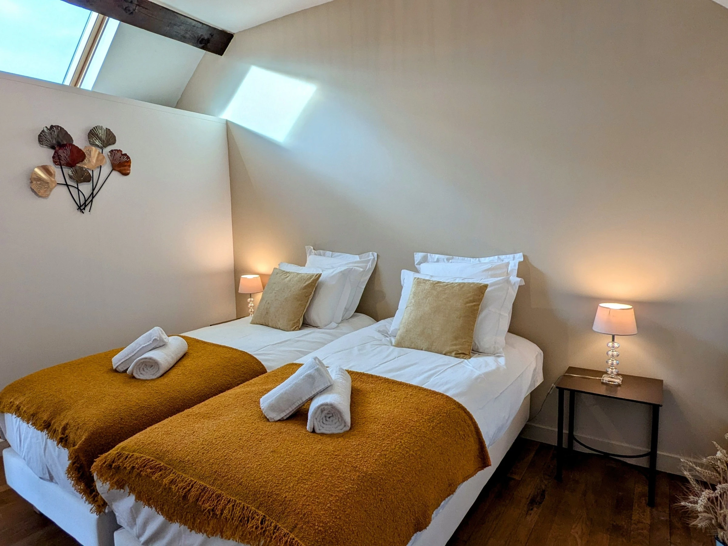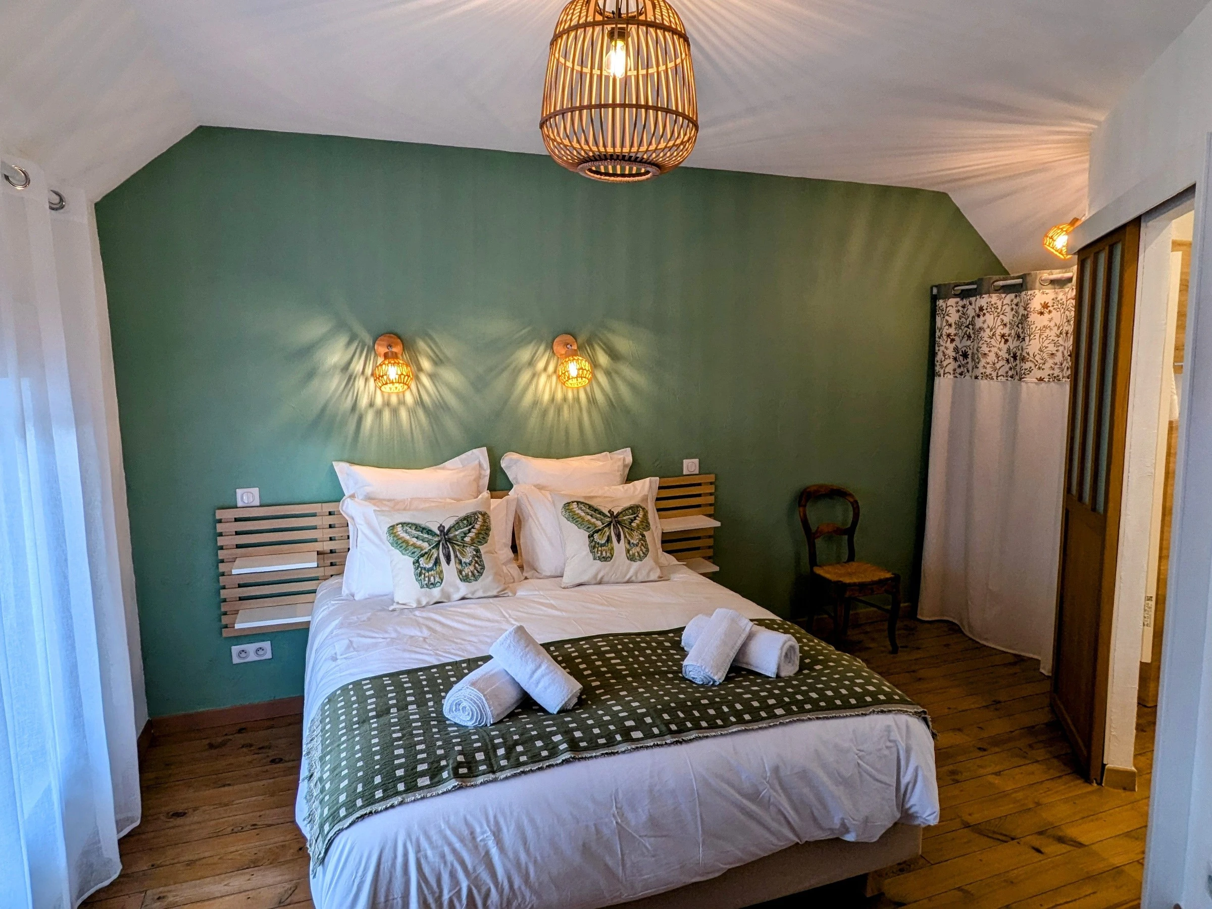 A l'étage, 3 chambres : 1 chambre avec 1 lit de 160x200 cm et salle d'eau privative avec WC, 1 chambre avec 2 lits de 90x200 cm jumelables, 1 chambre avec 1 lit de 160x200 cm. Salle d'eau avec douche italienne et WC. Draps, linge de toilette, ménage et électricité inclus. Bois de chauffage en supplément : 5€ l'unité.