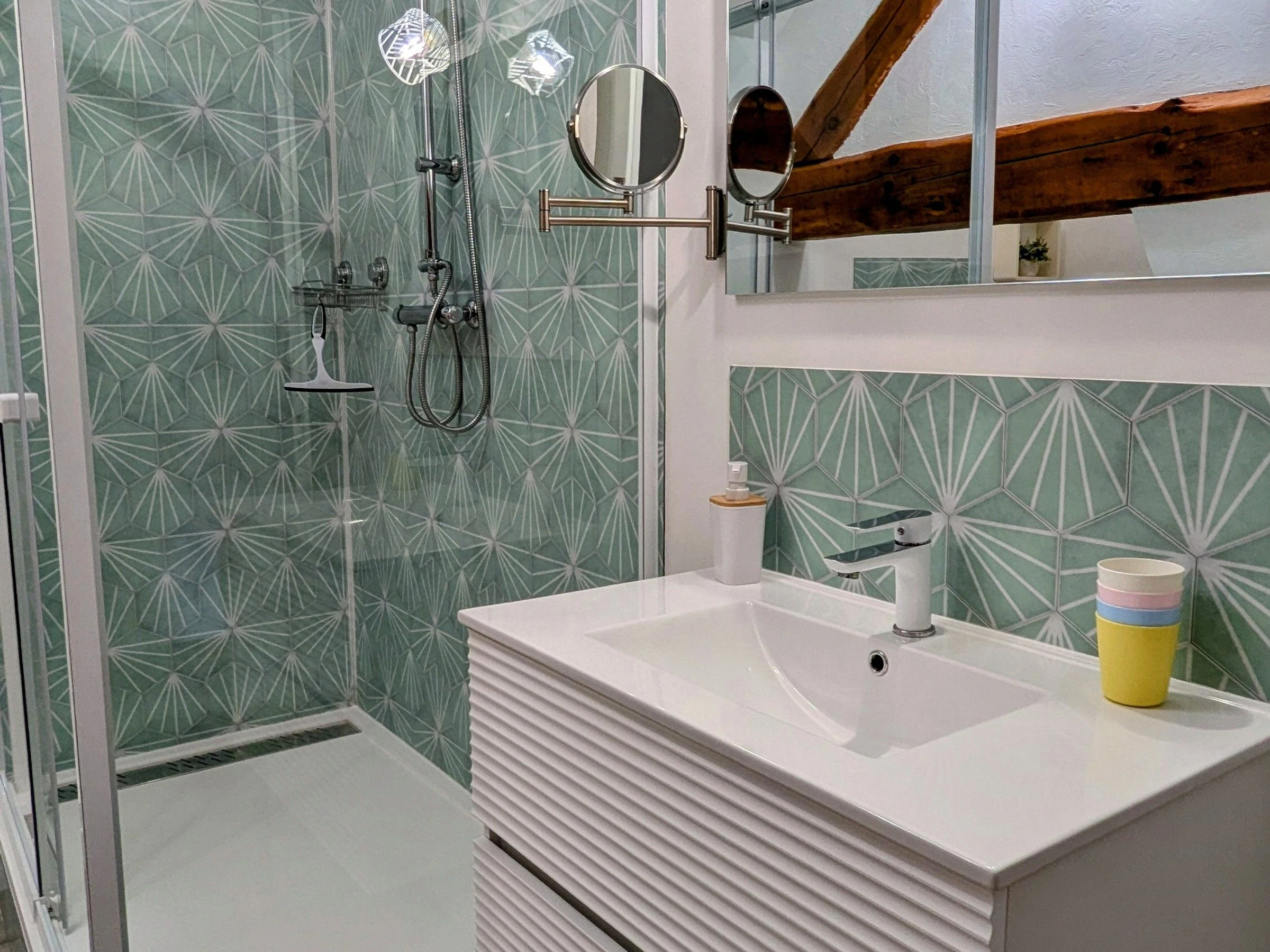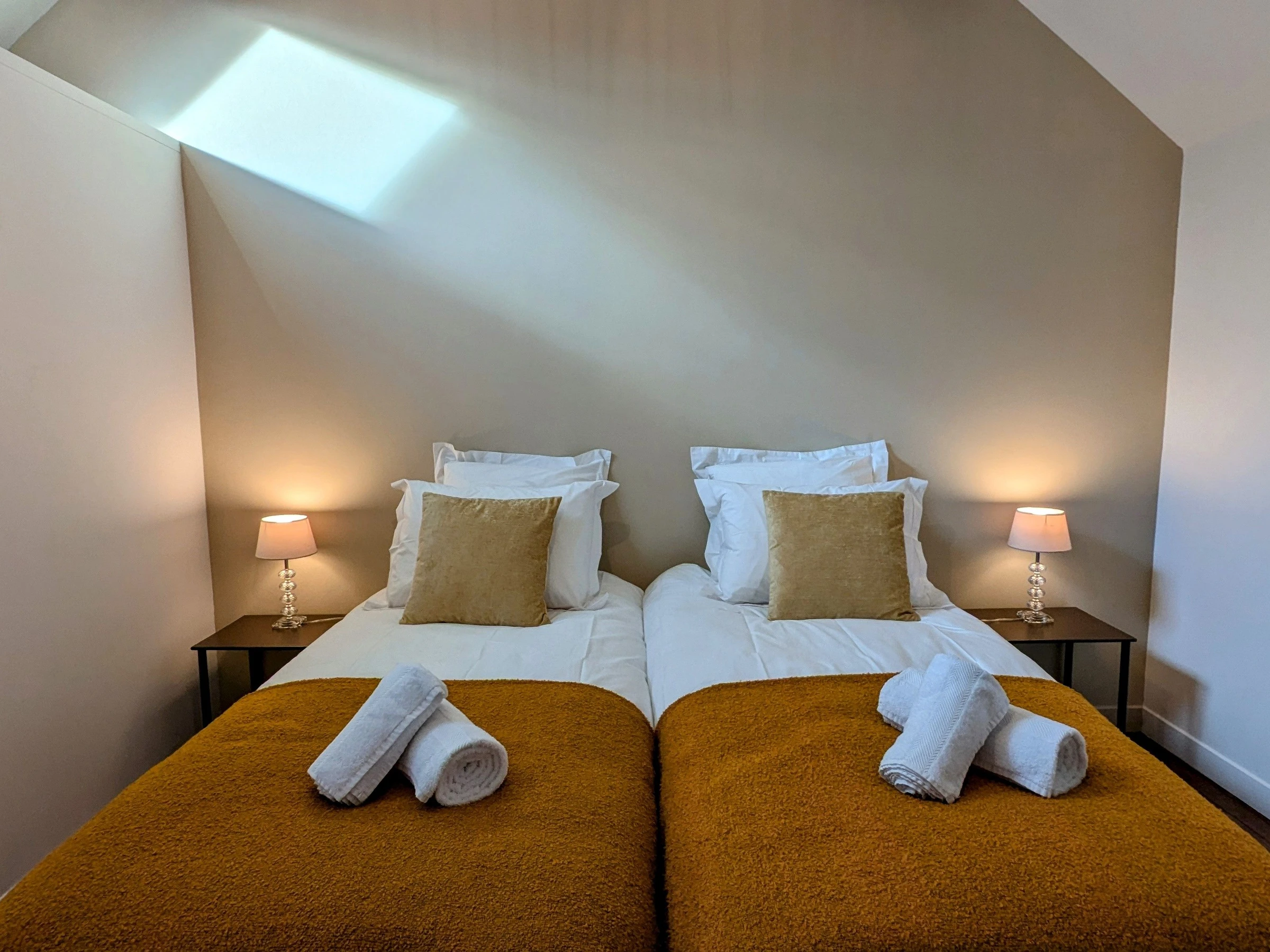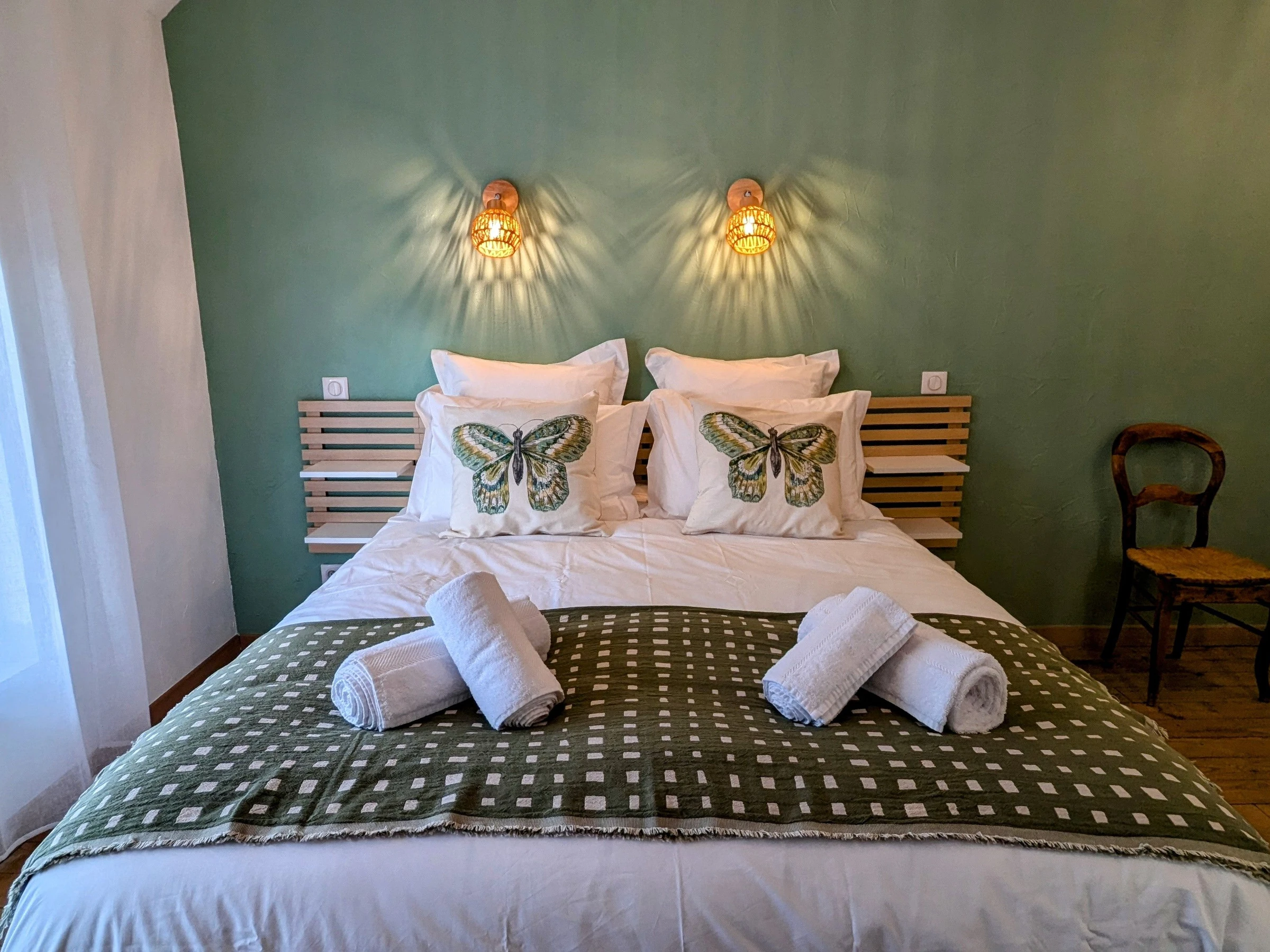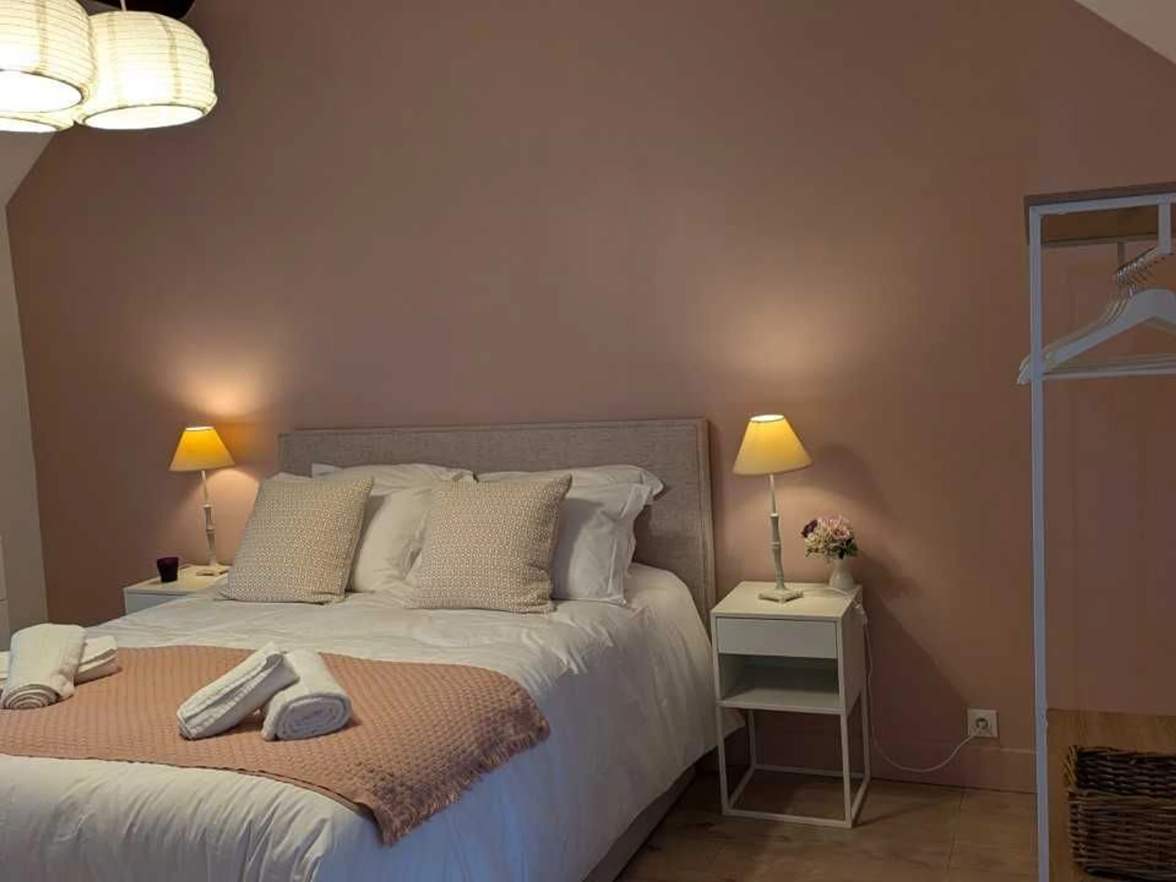 A l'étage, 3 chambres : 1 chambre avec 1 lit de 160x200 cm et salle d'eau privative avec WC, 1 chambre avec 2 lits de 90x200 cm jumelables, 1 chambre avec 1 lit de 160x200 cm. Salle d'eau avec douche italienne et WC. Draps, linge de toilette, ménage et électricité inclus. Bois de chauffage en supplément : 5€ l'unité.