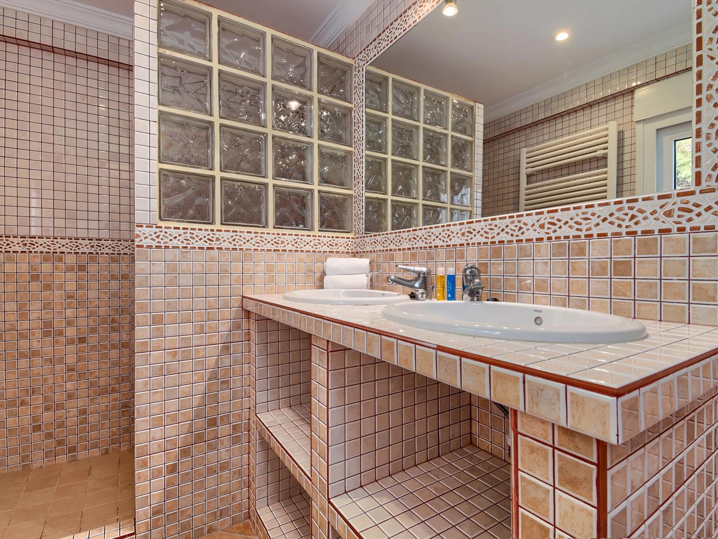 La villa dispose de 5 chambres, 4 salles de bains et 1 toilette pour invités,